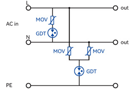 所有的電信設(shè)備網(wǎng)絡(luò)、家用電子設(shè)備等都是通過電力線網(wǎng)絡(luò)顯示在過壓浪涌的環(huán)境中。在這些情況下,氣體放電管(GDT)和壓敏電阻(MOV)的組合提供的保護(hù)。相位和中性導(dǎo)線連接到兩個保護(hù)元件的接地電位(電路如圖所示)