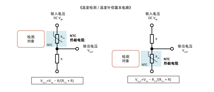 其基本電路是與NTC熱敏電阻以及固定電阻進(jìn)行串聯(lián)的分壓電路。CPU及功率模塊等安裝在發(fā)熱部位附近的NTC熱敏電阻的電阻值會隨溫度上升而下降,因此分壓電路的輸出電壓會發(fā)生變化。該變化輸送至微控制器后將會保護(hù)電路元件免受過熱造成的影響,或進(jìn)行溫度補(bǔ)償。 圖2 溫度檢測/溫度補(bǔ)償基本電路