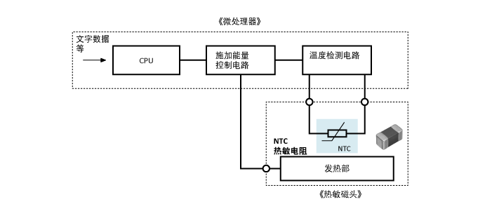 應(yīng)用示例:熱敏打印機(jī)的溫度檢測POS收銀臺的收據(jù)打印機(jī)、條形碼/標(biāo)簽打印機(jī)等使用有用于打印熱敏紙的熱敏打印機(jī)。熱敏打印機(jī)磁頭溫度與打印濃度呈相關(guān)關(guān)系,溫度越高,濃度則越高,溫度越低,濃度則越低。其根據(jù)檢測的熱敏磁頭溫度,通過改變輸送至熱敏磁頭脈沖電流,并控制電壓,從而使其保持一定的打印濃度。使用NTC熱敏電阻的溫度檢測電路方框圖示例如下圖所示。 圖8 熱敏打印機(jī)的溫度檢測