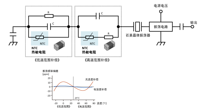 應(yīng)用示例:晶體振蕩器的溫度補(bǔ)償在電腦等電子設(shè)備中,若要產(chǎn)生基準(zhǔn)頻率(時鐘基準(zhǔn)信號),則需要使用利用晶振的晶體振蕩器。晶振溫度特性如下圖圖片曲線(紅線:無溫度補(bǔ)償)所示,呈現(xiàn)以基準(zhǔn)溫度(通常為25℃)為拐點(diǎn)的3次曲線,振動頻率偏差(縱軸)隨溫度發(fā)生大幅變化。而通過在低溫范圍與高溫范圍分別插入與晶振溫度特性相反的補(bǔ)償電路便可縮小振動頻率偏差(藍(lán)線:有溫度補(bǔ)償)。該補(bǔ)償電路為模擬方式,低溫范圍與高溫范圍的補(bǔ)償電路分別由NTC熱敏電阻與電容器、電阻構(gòu)成。內(nèi)置溫度補(bǔ)償電路的晶體振蕩器稱為TCXO(溫度補(bǔ)償型晶體振蕩器、Temperature Compensated Xtal Oscillator)。 圖10 晶體振蕩器的溫度補(bǔ)償