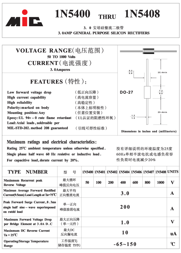 Eidoll Electronics Co., Ltd sales the MIC diode,such as :1N5400,1N5401.1N5402,1N5404,1N5406,1N5407,1N5408, the specification  as below: